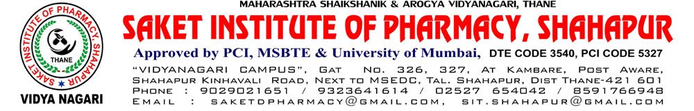 Saket Institute of Pharmacy is one of the prestigious and oldest constituent unit under Affiliated to MSBTE, established in 2024, whose foundation was laid by ------, who came from a farmer family of Shahapur, Thane, as a single donor to this institution. The name of ------ always stands apart and taken with deep respect because of his work in establishing educational institutions of repute. The college is imparting education in Pharmacy up to Degree levels along with UG teaching in the faculty of Pharmacy. The college is also running course under vocational/professional program.